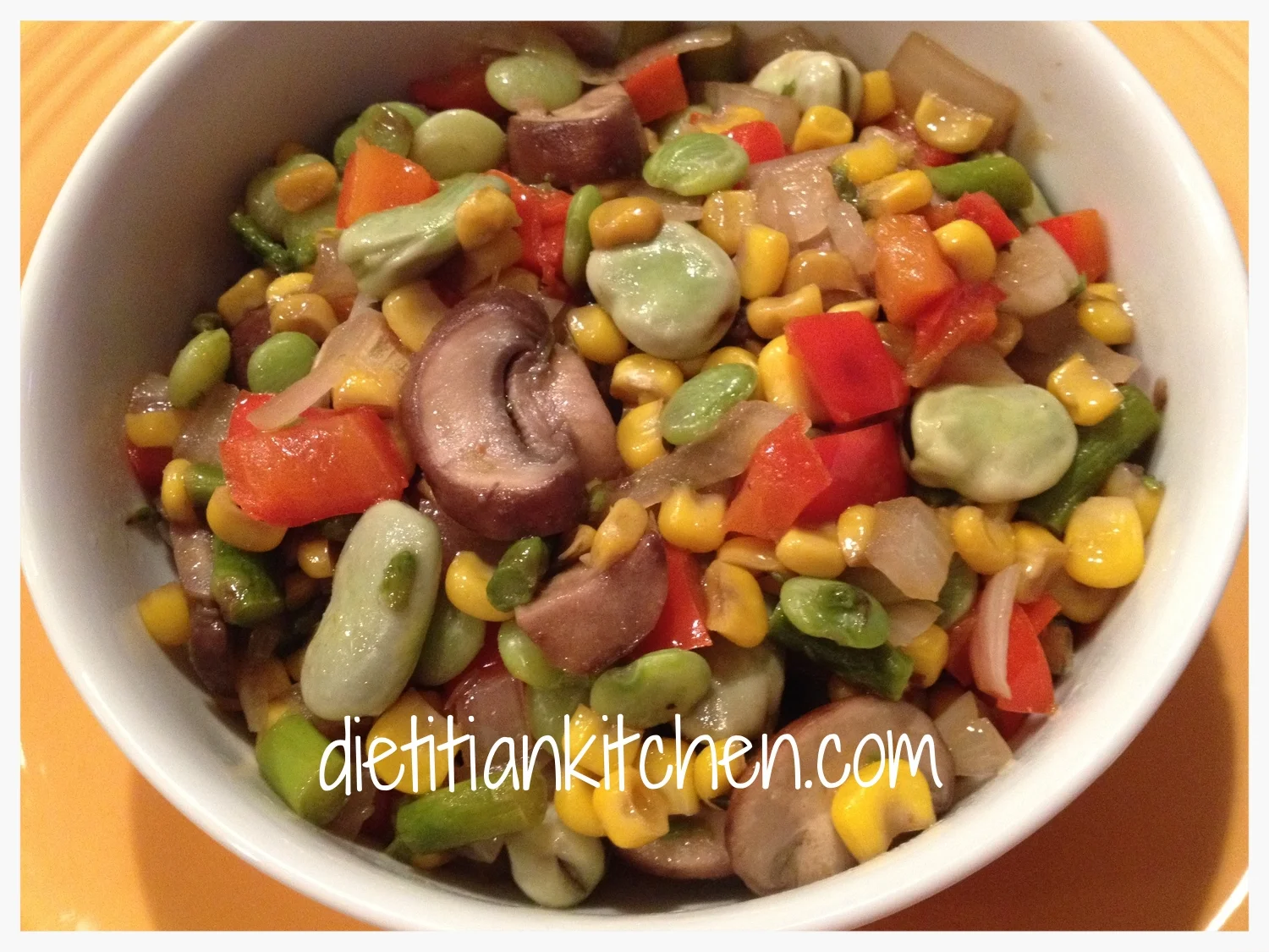 I typically go to the market on Mondays so by Sunday night, we are literally searching for food in the house. One Sunday evening, I had a red pepper, mushrooms, and onion, some fava beans, and corn in the freezer and somehow managed to come up with something delicious. This recipe is super easy, flavorful, and filling.